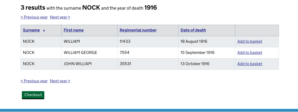 Soldier’s Wills is a separate index for the probate records of soldiers who died whilst serving in the British armed forces between 1850 and 1986. Apart from surname and year of death, other optional search fields are First Name, Month of Death, Day of Death and Regimental Number. It is therefore straightforward to see if, for example, an ancestor who died in the First World War left a will. With common names, the additional search fields can prove useful but with a rarer name, (such as Nock below), there will be just a few entries: