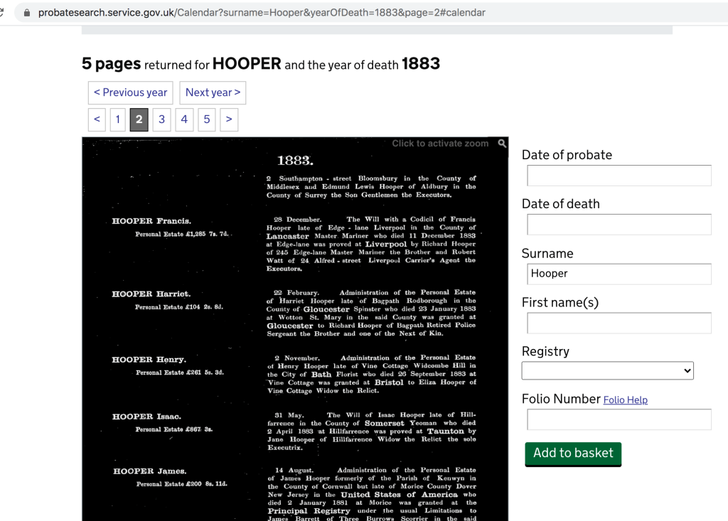 In the example below, there are five pages to search for the surname Hooper in 1883: