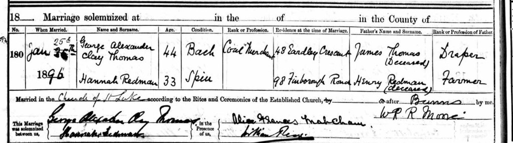 Hannah was 28 years old and working as a domestic servant for the Thomas family. The head of the household was James Thomas, a 70 year old linen draper, who was living with his 70 year old wife, Eliza, and son, G. A. Clay Thomas, who was 39 years old, single and a commercial draper. From subsequent events, it is clear that a romance was developing behind the scenes. This romance led to a proposal and on January 25th 1896, George, Alexander Clay Thomas married Hannah Redman: