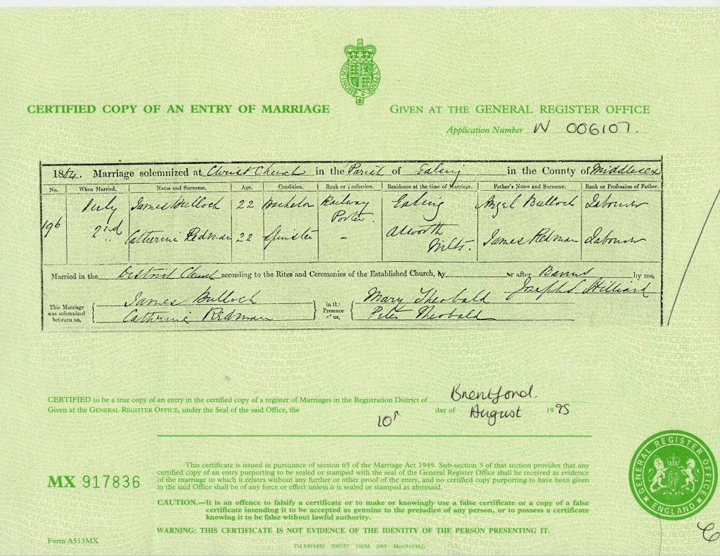 James Bullock had been born in Compton Bassett, Wiltshire, in 1841. As a young man, he had made up his mind that he wanted a different life from his father, Angel Bullock. He was ready to leave home and find adventure, working on the railway rather than on the land. His railway employment records state that he entered service at the age of 22, just before his marriage in 1864. With his new job as a porter at Ealing station, James and his sweetheart, Catherine, probably accompanied by little Hannah, started their married life, away from their rural roots. Ealing, with its easy access into central London, had grown from a small village to a popular suburb following the arrival of the Great Western Railway in the 1830s, which linked Bristol to London.
