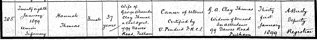 Sadly, the marriage of George and Hannah was to be short-lived. A search of the 1901 census revealed no sign of the couple. Perhaps George had died and Hannah had married again? However, a careful search of the General Register Office (GRO) death indexes revealed the death of a Hannah Thomas, aged 37, registered in Fulham in the March quarter of 1899. I obtained a copy of the death certificate and found that Hannah had indeed tragically died: