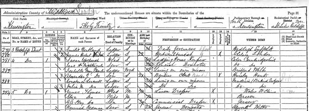 For the next twenty years, I lose sight of Hannah. By the time of the 1881 census, she would have been 18 years old, and was out in the world. In the meantime, the Bullock family had expanded with the birth of Ernest Bruce Wright in 1873, North Rees in 1876 and Ruth Rose in 1878. In all likelihood, Hannah was working in service from her youth. I caught up with her in the 1891 census: