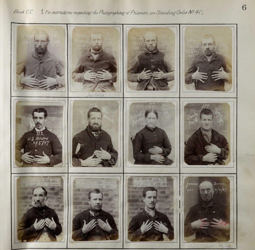These mugshots of prisoners were taken so that they could be passed around local police forces, making it easier to identify habitual offenders. From the early 1900s, side shots were taken as well. I find these photographs rather haunting: some faces look defiant, others sad. Each prisoner is holding their hands up, as it was not uncommon for offenders to have fingers missing or injuries to their hands. Some would also habitually wear rings that could be of aid in distinguishing them from others.