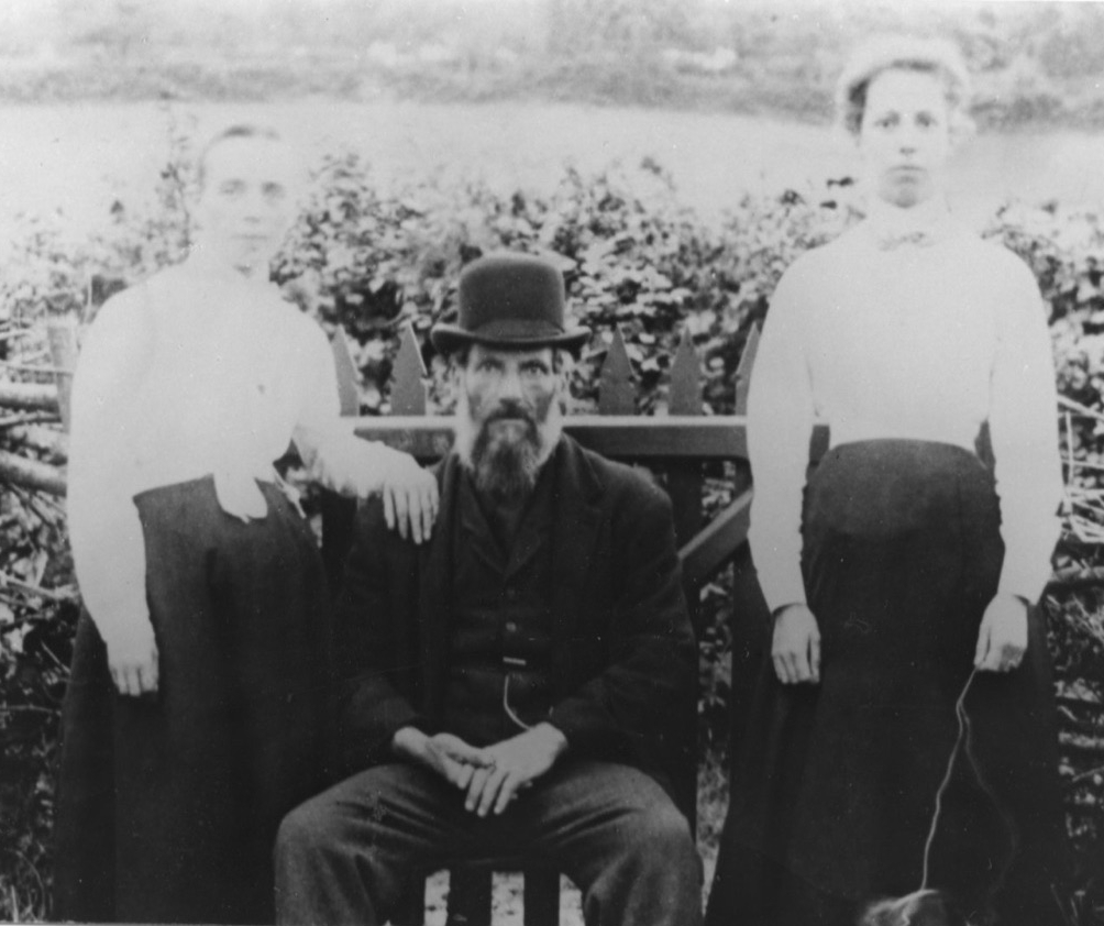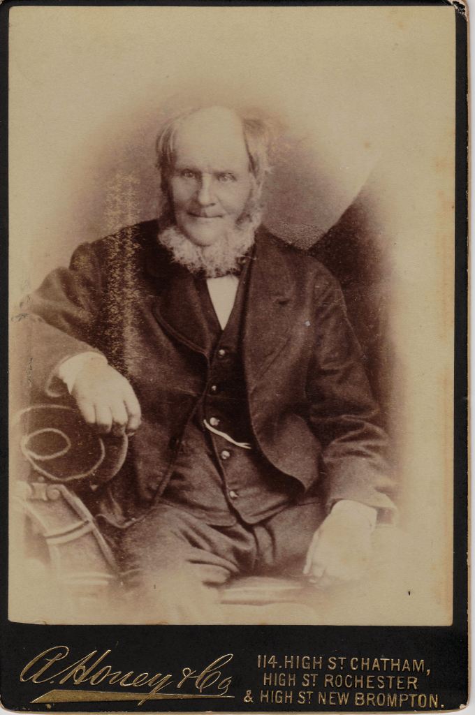 I have one photograph that I believe to be George Nock, with his daughter, Lucy, my great grandmother on his right, and her elder sister, Eliza, on his left. There is a huge contrast between the portrait and the photograph but after studying it closely, I believe they both depict George Nock. The portrait looks as if it might have been painted when George was in his 40s so 1855-1865, whilst the photographs was probably taken in the 1880s when George was ca. 70, prior to Lucy’s marriage in 1888: