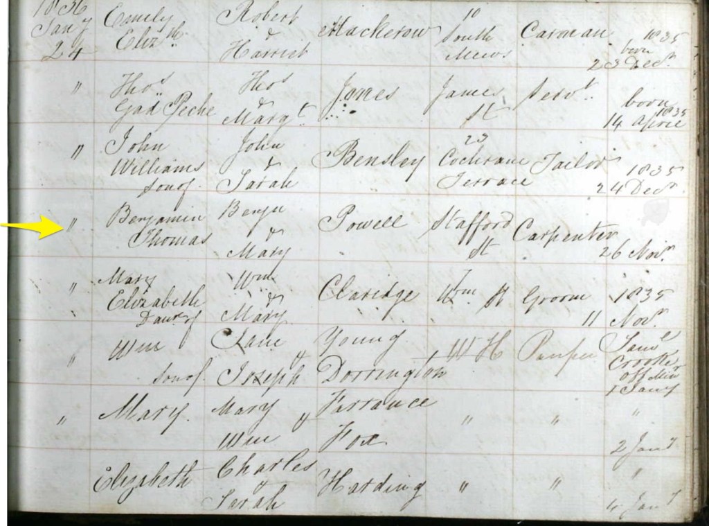 I found the baptisms of three children of Benjamin and Mary Powell in the registers of St Nicholas, Chiswick. The family were resident in Turnham Green, an area of Chiswick, and also Hammersmith. Benjamin Powell was recorded on each occasion as a carpenter and his wife was named as Mary Ann when their daughter Emma was baptised: