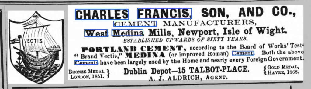 A cement company named Charles Francis & Sons had purchased the site at West Medina Mill around 1841 for the purpose of setting up a cement mill. The shoreline provided an excellent source of the “Septaria” stones from which the desirable Roman cement was made. The tidal power of the old corn mill situated there and easy access to the sea for landing raw materials and delivering the finished cement made it the perfect location. The cement that they produced here was especially hard and set underwater. This “Medina Cement” was of such high quality that it won several medals at exhibitions. In the 1850s, the company, using innovative techniques, produced “Portland Cement” which was of an even higher quality. To make cement, chalk was ground in the mill and mixed with clay and water in a wash-mill. This produced a thin “slurry”which flowed into large drying reservoirs called “slurry backs”. Over a few weeks, the water was drained off and the solids gradually sank to the bottom. When it was dry enough to dig out in lumps, it was taken by wheelbarrow to the “drying floors”. It was then heated from below until it was dry enough to be fired in the kilns. After this, it was stored in barrels, ready to be shipped. Despite some turbulent times in the industry, the mill was exporting cement around the world for nearly 100 years until it closed down at the outbreak of the Second World War.