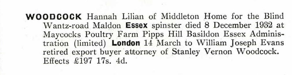 Hannah was buried with her parents in the churchyard of Great Bursted. Her death had occurred nearby at Pipps Hill Road, very close to her former home at Oak Hill Lane, Basildon. However, from the administration produced to settle her estate, I discovered that she was actually a resident of Middleton Home for the Blind, which was situated in the town of Maldon, Essex, nearly twenty miles away: