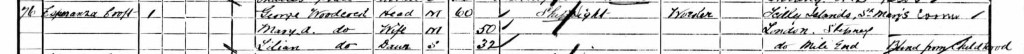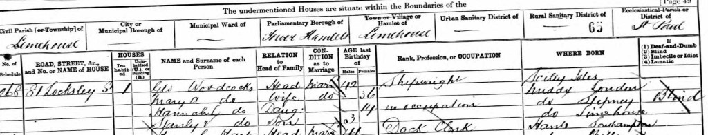 The Woodcock family were still living at 81 Locksley Street, Limehouse in 1891. The census records report that she had been blind from childhood: