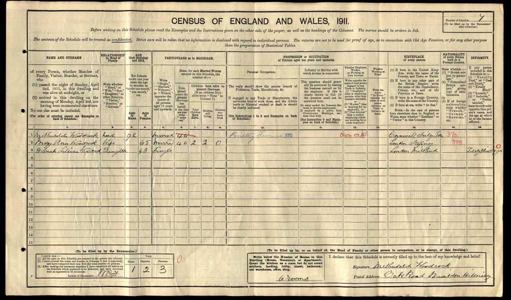 In 1911, the age at which a person had been afflicted was added to the infirmity column in the census records. By this date, Hannah’s father had retired from his work as a shipwright and had become a poultry farmer full time. In 1911, the census schedules were filled in by the householder and here we see that Hannah’s father had written “Totally Blind 7 Years” in the infirmity column. Hannah had gone blind ca. 1873 when she was just seven years of age: