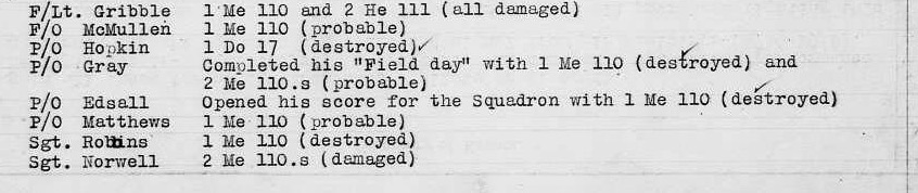 The enemy had caught Hornchurch unawares and it was lucky escape, as despite the large number of bombs, there were no Squadron casualties apart from the three machines lost. The remainder of the Squadron succeeded in destroying one Me 109 (shared between F/Lt Gribble and Sgt Norwell), and one Do 17 probable, shared between F/O McMullen and a Hurricane pilot from another Squadron. Some ribbing occurred with jokes about adding cows to one’s personal tally when this story was related: