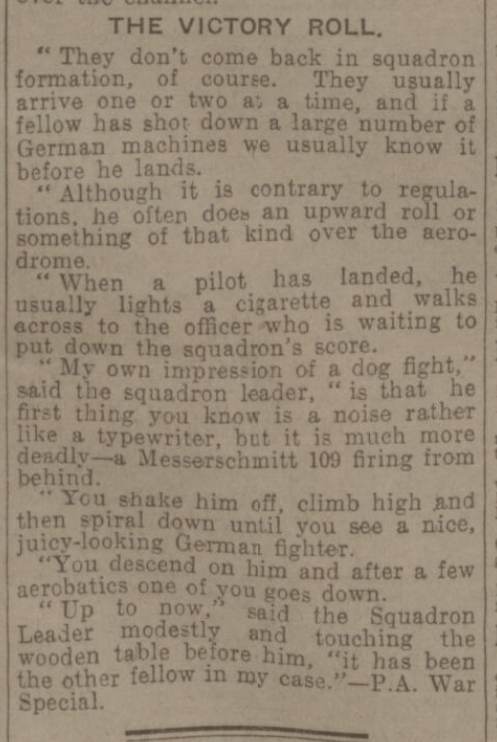 “Though the score is small for each successive sortie, it is none the less sure. The turning back and splitting up of the Hun formation is an accomplishment in itself. During these last eighteen days’ fight for England, the Squadron has destroyed, probably destroyed or severely damaged 70 enemy planes.