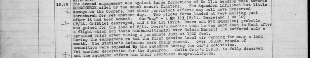 Manston was made serviceable in a matter of hours and miraculously, no spitfires were hit when the bombs fell as they were taking off, though there were several casualties amongst station staff. The Squadron’s “bag” included one Me 113 (F/Lt Deere), one Me 109 (F/Lt Gribble) and two He 113 probables (F/Lt Deere and P/O McMullen). Characteristically, F/Lt Deere had an adventure all of his own. After straying over to France in pursuit of a Me 109, he was chased back to England and shot down over Kent. He ended the day parachuting to safety and was lucky to escape with just a wrist injury. Welcome news of a D.F.C. awarded to Colin Gray was also received by the Squadron.