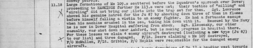 Sgt. Lawrence showing his “genuine hatred”, shot down three Ju 87s before being shot down himself, luckily crashing into the sea where he was rescued by the Navy. Both him and Sgt. Klozenski landed up in hospital that day. Any respite was brief, as another scramble meant that the boys were up in the air again later that evening:
