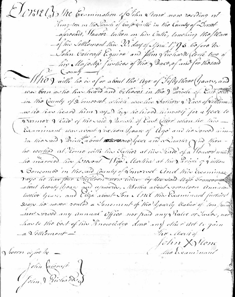 This settlement examination reveals that John Stone believed he was born around 1740 in East Coker, Somerset. When he was about sixteen years old, he went to work for Farmer Slade in East Coker for a year and a quarter. He then went back to work as a weaver for his father, who followed that trade. There is further information on his two wives and four children.