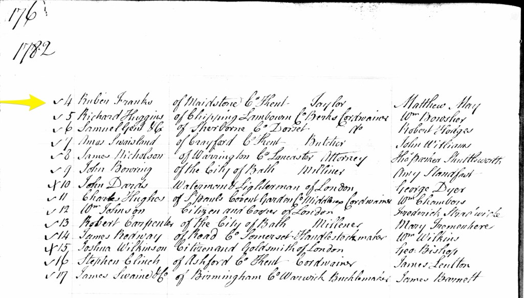 Reuben Franks is a taylor [sic] of Maidstone and had an apprentice, Matthew May. He paid a tax of £4 in 1782.