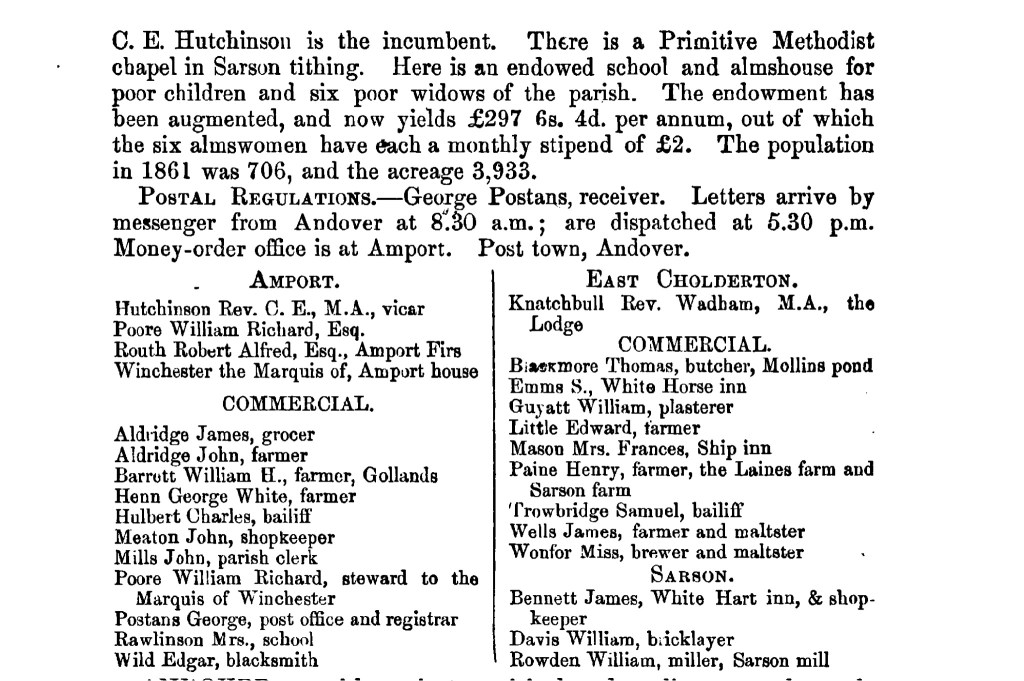 Sadly, women’s employment is typically underreported although they undoubtedly contributed to the family income, especially in areas where factory work was available after the Industrial Revolution. At earlier dates, many women would have been involved in cottage industries, helping to supplement their husband’s wages through their industry at home. The focus in census returns is generally on the occupation of the head of the household but there is no doubt that many working class wives had jobs too. They would also help out in the business if their husband had a trade or shop. Single women and widows are most likely to have their occupations recorded. They often got by through working as dressmakers or as laundresses in later life. Many of my female ancestors also worked as domestic servants prior to their marriage, as is evidenced from census returns. Information on women’s work may also be found in newspapers and trade directories. This trade directory reveals that there were several women who were in charge of businesses in the small village of Amport in Hampshire: