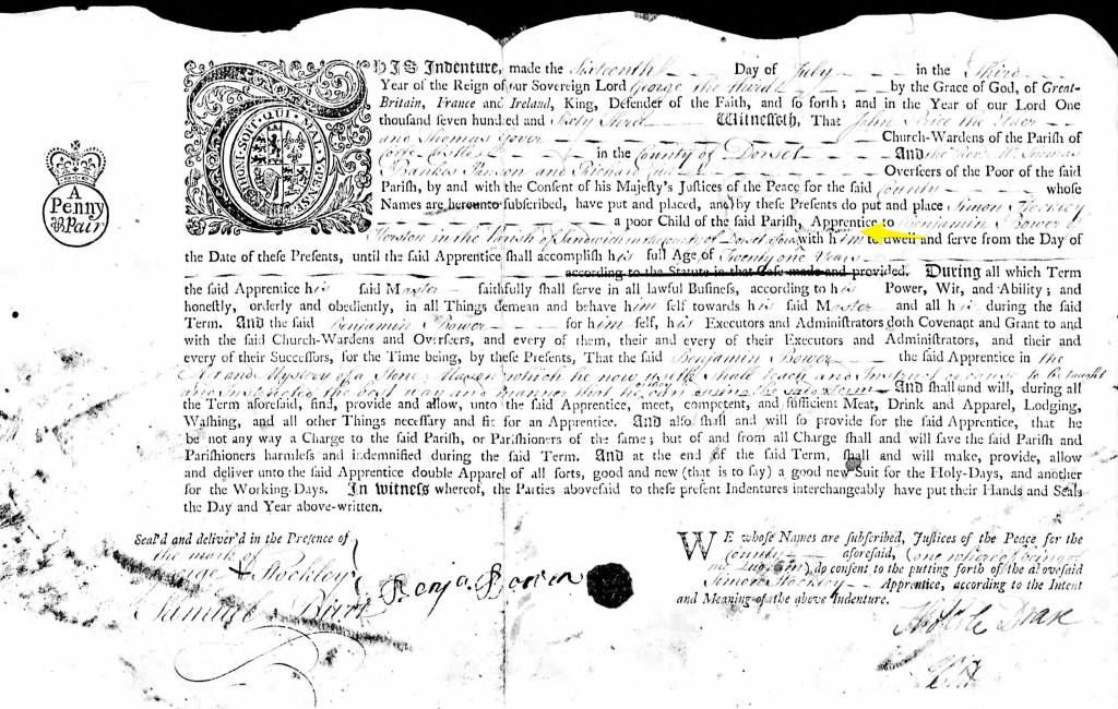 Records associated with apprenticeship are an important source for occupations. In 1550, the Statute of Artificers brought in a system of apprenticeship. Typically, an apprentice would learn a specific trade from a master for a term of seven years, beginning at the age of 14. The apprentice would receive board and lodging and the master would receive a premium (and free labour) in return. Upon completion of a masterpiece, the apprentice would gain the right to practice a craft. Apprenticeship was also one of the main ways of joining a guild, which often went hand in hand with becoming a freeman of a city. From the mid-1550s to 1751, apprenticeship records are particularly useful as they provide the names of the apprentice’s parents, occupation and place of residence. After this date the system went into decline in favour of wage labour though guilds continued to enroll apprentices, and parish apprenticeship remained a popular way of getting children off the hands of the parish and teaching them a useful trade. The indenture below (evidenced by the wavy line), is the parish apprenticeship for Simon Stockley, a poor child of Corfe Castle, Dorset, who was apprenticed to Benjamin Bower, a stone mason of Herston, Sandwich, Dorset on July 16 1763: