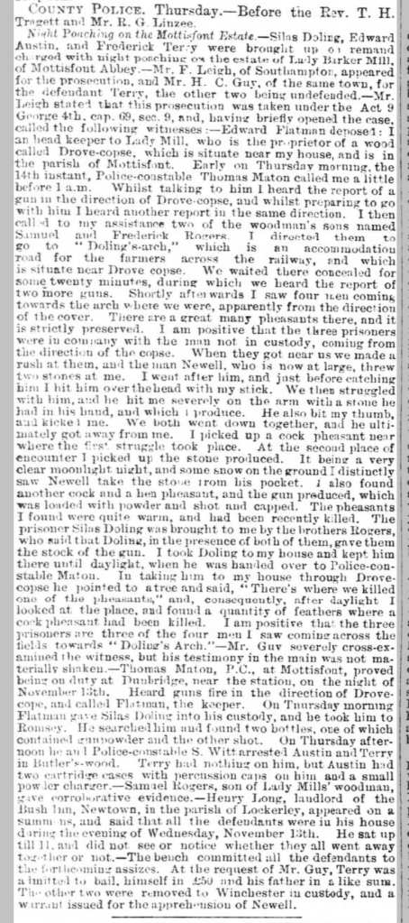 Newspapers are another wonderful source for knowledge of an ancestor’s occupation. As mentioned, my ancestor, Thomas Maton, joined the police. I have found several newspaper articles that detail some incidents in his career, which give you a flavour of what his job involved. This is an account of him challenging poachers on the Mottisfont Estate in Hampshire: