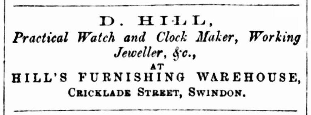 If your ancestor had their own business, you may find an advertisement, either in a newspaper or a trade directory, such as the one below for D. Hill, a “Practical Watch and Clock Maker, Working Jeweller &.c”, which appears in a local newspaper in Wiltshire in 1868: