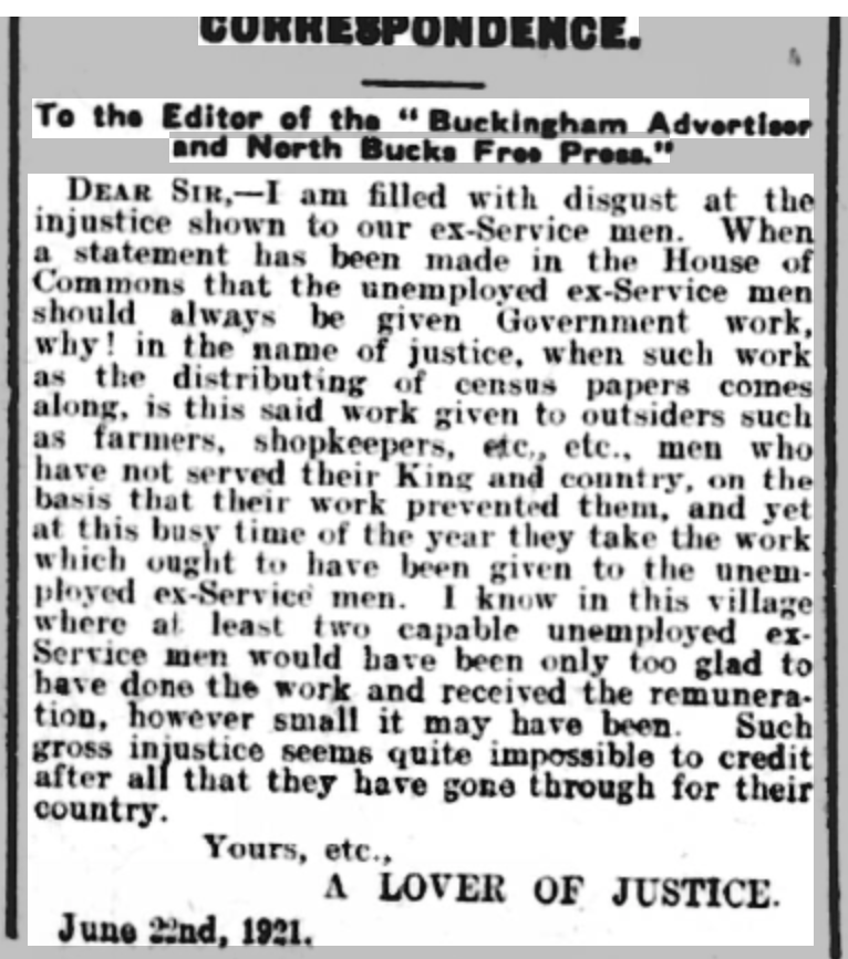 With so many enumerators needed, it was hoped that many unemployed ex-serviceman would take on the role. However, judging by comments in the Press, many people felt that numerous deserving candidates had been overlooked in favour of local worthies. This caused some outrage, summed up in this letter from “A Lover of Justice” to the Editor of The Buckinghamshire Advertiser and Free Press: