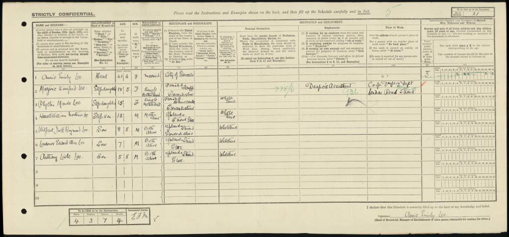 A few years after their arrival, the family headed by Annie, aged 41, her three stepchildren, Marjorie aged 18, Phyllis aged 15 and Harold aged 13, plus her own three children, Wilfred aged 8, Laurence aged 7 and Anthony aged 5, were recorded in the 1921 census: