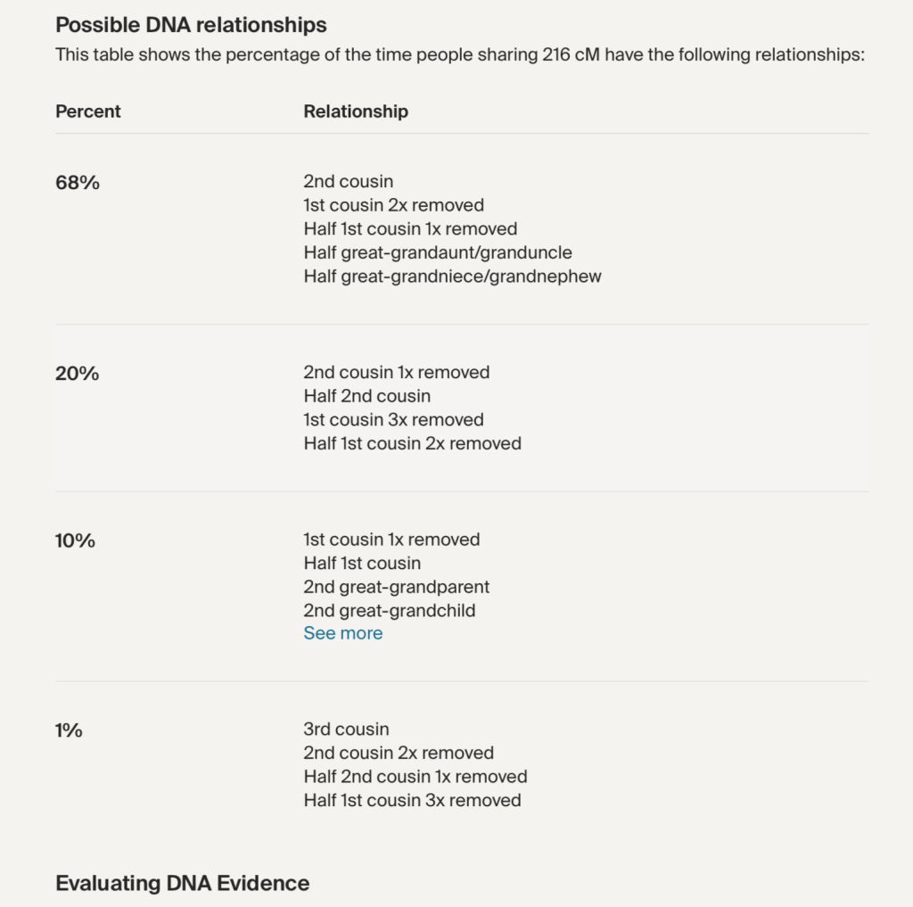 - Although I have 46 matches in the “Extended Family” range of 34-216 CM, many of these are 4th cousins or even remoter. It is easy to get into the mindset that a high number of CM must indicate a close relationship or a low number of CM must indicate a distant relationship but it is not necessarily the case within certain parameters. For example, a recent match, Kenneth, came in with 111CM across 5 segments. I was surprised to work out that we were in fact, 4th cousins. It is rare for a 4th cousin to share so many CMs but it is not impossible. Similarly, I have a 3rd cousin with only 12CM. Although there is a typical range of CM for a particular relationship, and Ancestry estimates a percentage of probability, it is still quite possible to share a much higher or lower amount than is typical.