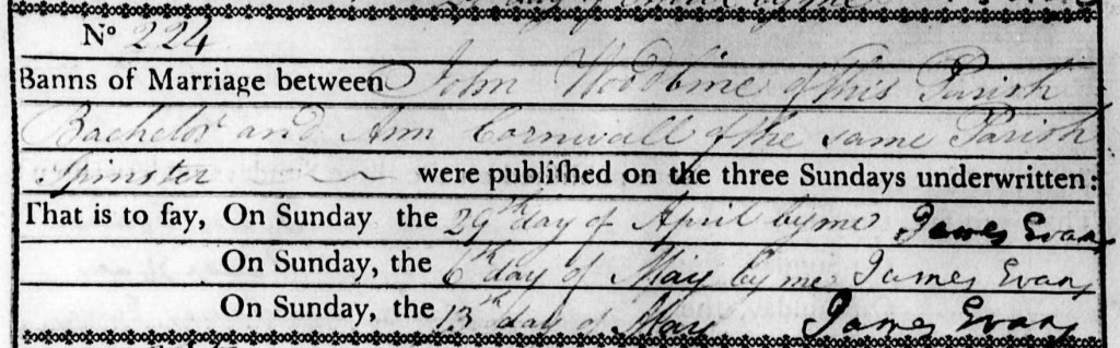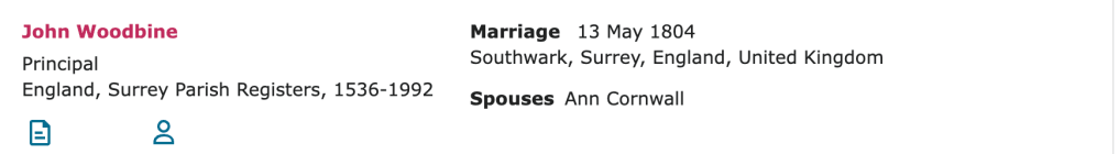 John Woodbine and Ann Cornwall had allegedly married on May 13th 1804 in the parish of St Olave, Southwark. What was going on? Had the couple married twice?