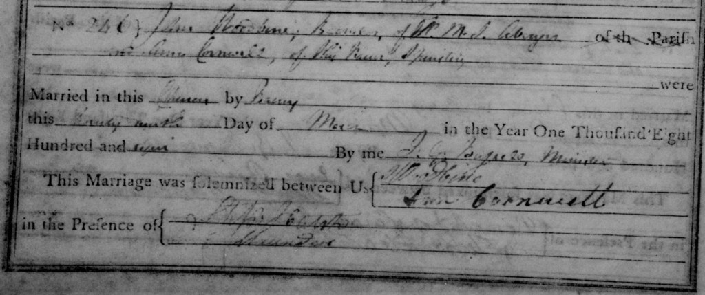 John Woodbine was described as a bachelor of HMS Avenger whilst his bride, Ann Cornwall, was a spinster “of this parish”. They married by licence on March 27th 1808 at the parish church of St Thomas, Portsmouth (now Portsmouth Cathedral). A lot of naval marriages are recorded in the registers of St Thomas, as sailors from the various ships that were docked in Portsmouth, took the opportunity to get hitched whilst they had shore leave.