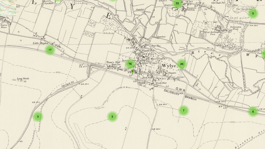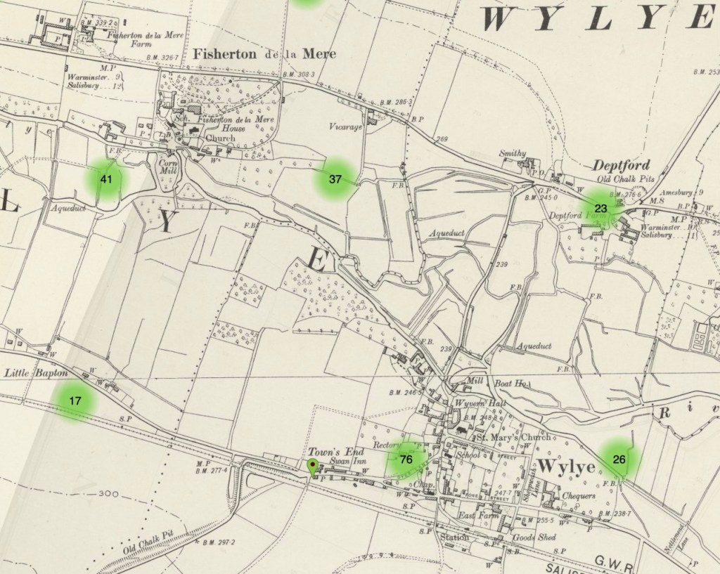 The Ordnance Survey map reveals that the timber yard owned by William Fleming was in the hamlet of Deptford, situated to the north of the Wylye, where the smithy was situated some years later. Philip Bennett’s house, Plot No. 14, was at Town’s End (marked on the map with a green pin). Plot No. 15, where his garden was situated, was next door. If he did indeed work for William Fleming, you can see the likely route he would have taken to get to work in Deptford: