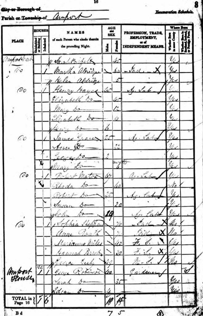 Over the border in Hampshire, my ancestor, Robert Maton, an agricultural labourer, was living with his family in the parish of Amport, near Andover when the 1841 census was taken: